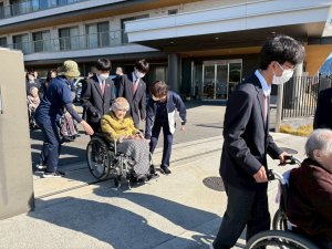 子供達は洗心園の職員の方に車椅子の使い方や、注意事項をしっかり教わり、 自分達で車椅子に乗ってみたりし、準備万端で利用者さんを迎えました。